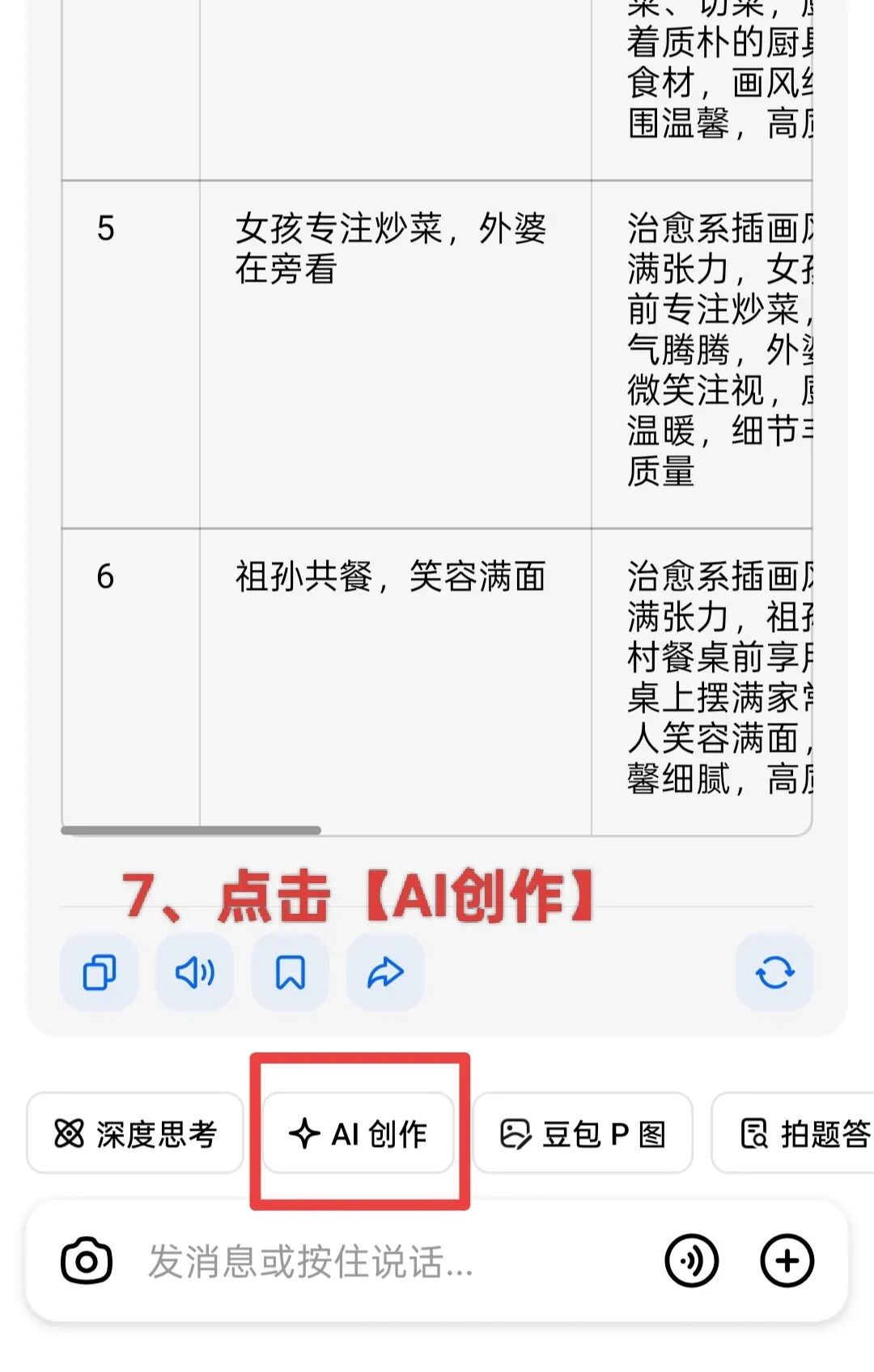 ✔ 点击【AI创作】:继续停留在豆包操作页面,在下方功能栏里点击【AI 创作】;