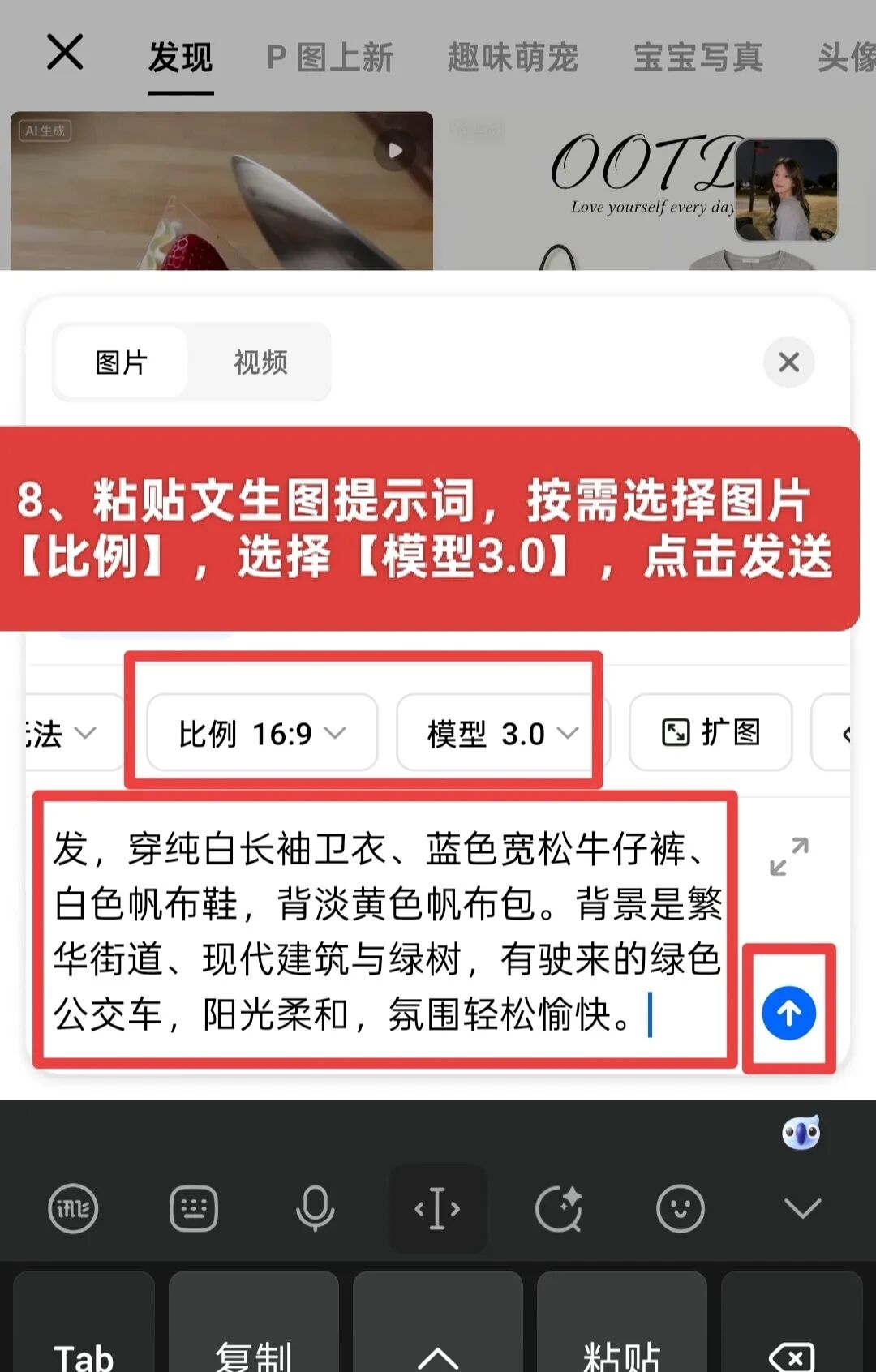 ✔ 开始作图:粘贴文生图提示词 → 选择【图片3.0模型】→ 按需选择图片【比例】→ 点击发送,生成图片。