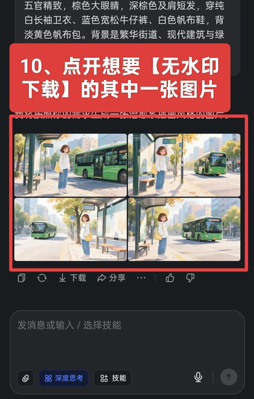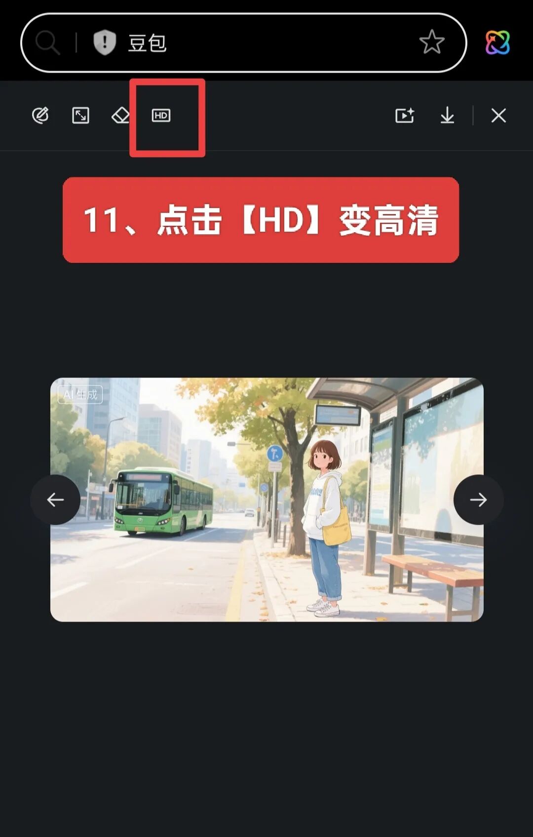 🔹 图片变高清:点开需要【无水印】下载的图片,点击【HD】,随后返回对话页面;