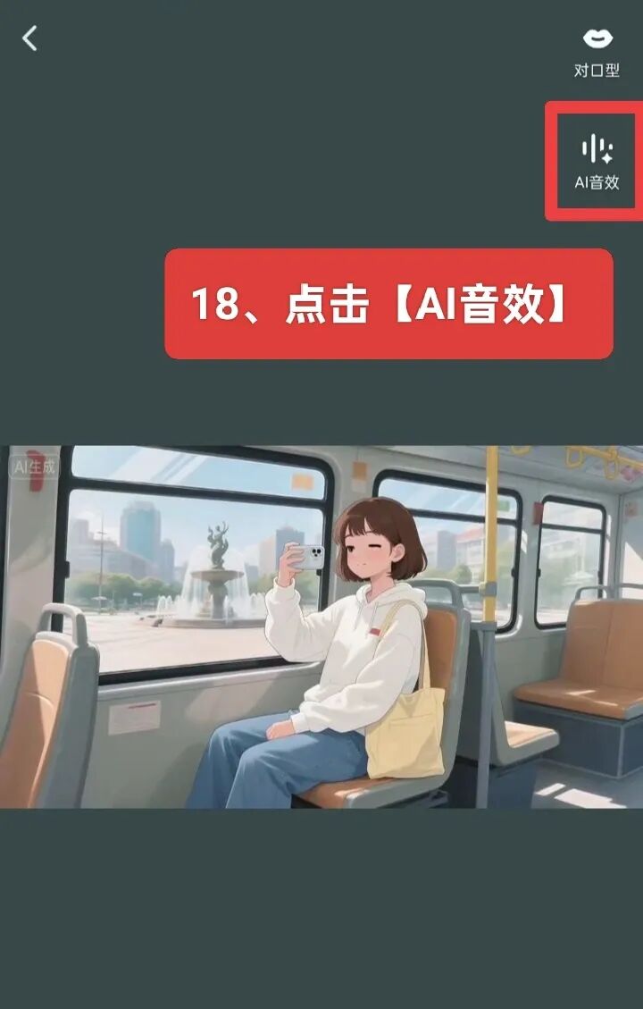 🔹 添加音效:点开需要添加音效的视频片段 → 在右上方功能栏中点击【AI音效】;