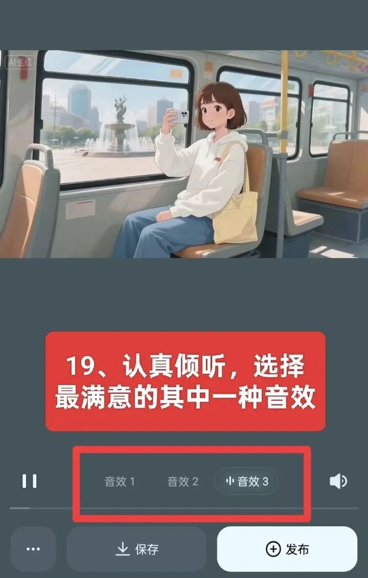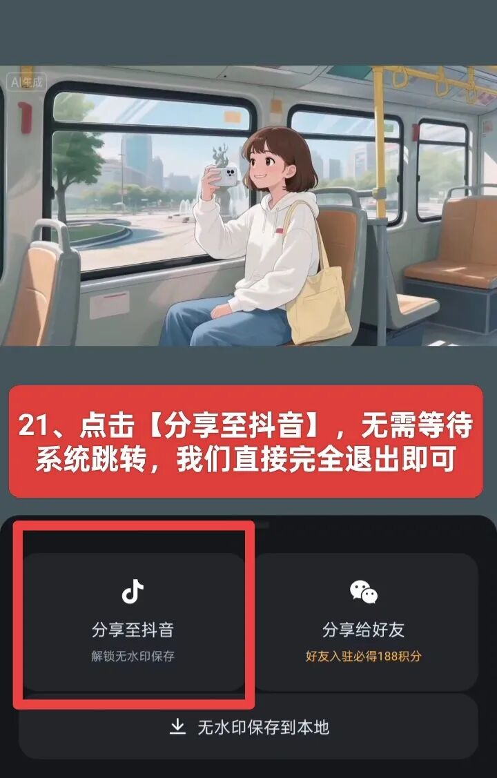 🔹 无水印保存视频:选择最满意的一种音效并点击【保存】→ 点击【分享至抖音】→ 无需等待跳转,完全退出至手机主页面,即可从系统相册中找到刚刚那段视频啦!