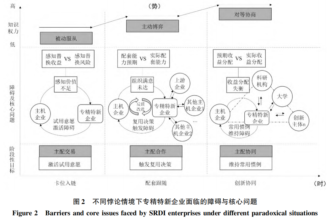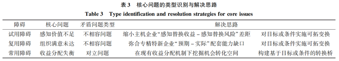 第二,破解“冷启动悖论” 需结合专精特新企业配套行为阶段与知识权力状态动态识别组织所处的悖论情境,存在“卡位入链 - 被动服从” “配套跟随 - 主动博弈” 和“创新协同 - 对等协商” 三种典型情境。不同悖论情境下,专精特新企业亟待解决的核心问题也不同。破解悖论需克服试用意愿激活、复用决策触发和常用惯例维持三重障碍,分别针对感知价值不足、组织满意未达与收益分配失衡三个核心问题进行靶向突破,继而逐次破解国产替代“冷启动悖论”。本文解构了关键零配件国产替代“冷启动悖论”具有内隐性、复杂性特征的理论黑箱,贡献于关键零配件国产替代的微观机制研究。