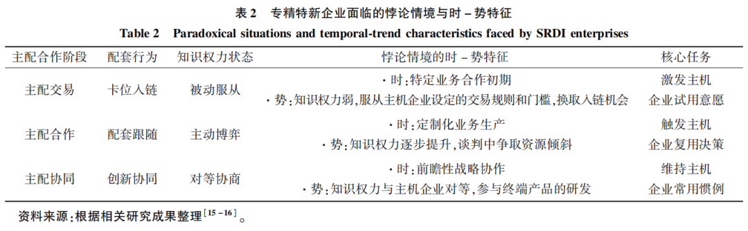 专精特新企业配套行为的演化刻画出主配关系由交易向战略合作动态发展,知识权力的演化则反映了企业在订单数量、生产排期和交付方式等关键交易要素上的议价能力和话语权[15],两者共同影响着企业在合作中的机遇和挑战。鉴于此,本文基于“交易 - 合作 - 协同”框架,借鉴既有研究[15-16]识别了三种典型悖论情境(如表2所示)。