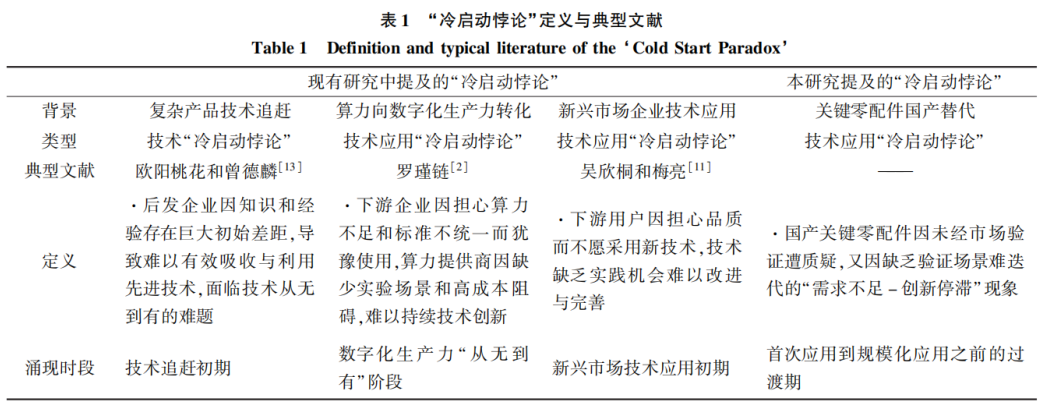 专精特新企业作为突破产业链关键领域瓶颈的生力军[1],其关键零配件(如零部件、元器件及配套产品)常陷入“不敢用 - 缺验证 - 难优化”的“冷启动悖论” (下文简称悖论):主机企业因国产零配件缺乏市场验证而质疑其质量,而验证机会的缺失又导致其技术迭代受阻,造成“需求不足 - 创新停滞”的恶性循环[2]。