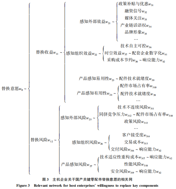 wij代表相关网中第i层中的第j位物元。主机企业关于国产零配件替换意愿w0的相关网如图3所示。