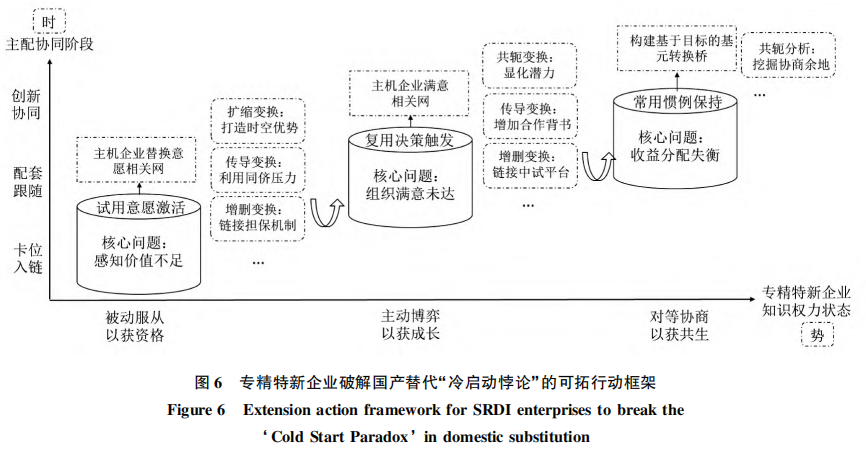 第三,可拓理论为专精特新企业破解国产替代“冷启动悖论”提供系统方法论。本文构建了基于“情境识别 - 障碍分析 - 策略生成”的悖论行动框架,对感知价值不足、组织满意未达和收益分配失衡三个核心问题,实施“矛盾问题识别 - 可拓模型构建 - 拓展分析 - 策略生成”行动步骤。具体地,克服感知价值不足问题,需构建“感知收益 - 感知风险”的有效平衡机制,如打造时空优势、善用同侪竞争压力和链接政府资源等,激活主机企业试用意愿;克服组织满意未达问题,需从弥合专精特新企业配套能力缺口入手,如提升动态能力、链接中试平台和增加合作背书等,触发主机企业复用决策;克服收益分配失衡问题,需从缩小实际与预期分配比例差距入手,如充分挖掘合作机会与协商余地,维持主机企业常用惯例。此外,专精特新企业可结合矛盾问题的具体特征与实际情况,在当前可拓行动框架(如图6所示)和现有可拓模型的基础上,进一步补充与扩展。 本文立足于学理价值挖掘,将可拓理论解决矛盾问题的创新思维范式迁移至专精特新企业破解关键零配件国产替代“冷启动悖论” 的研究领域,拓展了可拓理论在国产替代研究领域的应用边界。