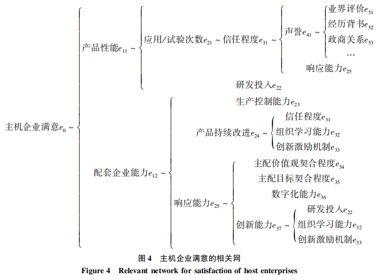 从对专精特新企业能力满意和产品满意两个角度,构建主机企业满意的相关网,如图4所示。