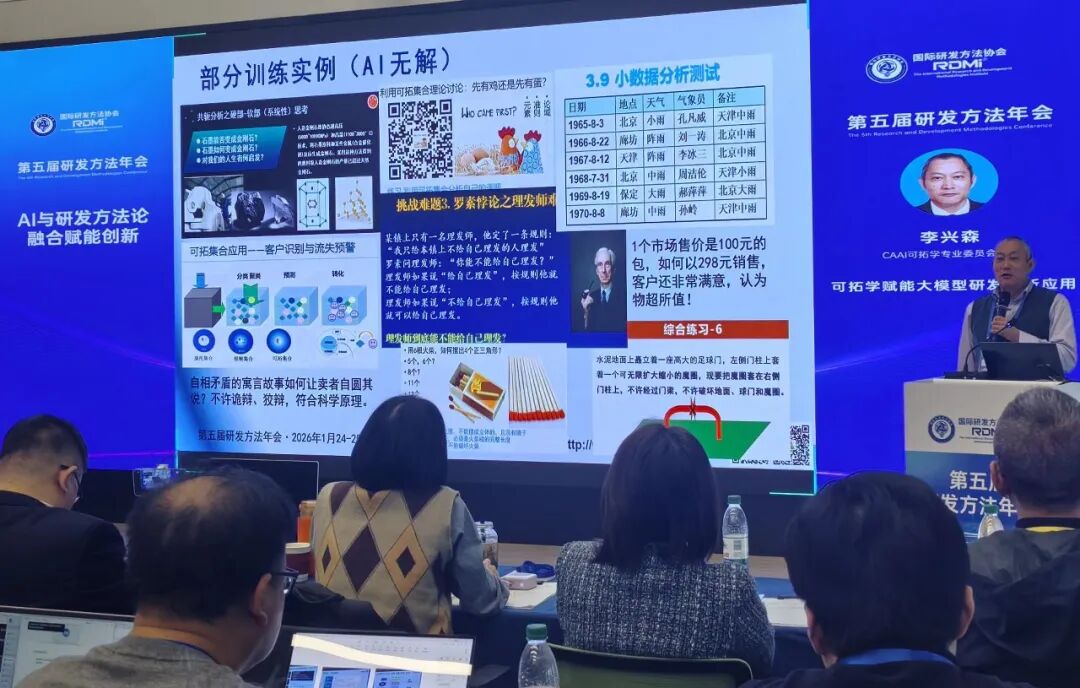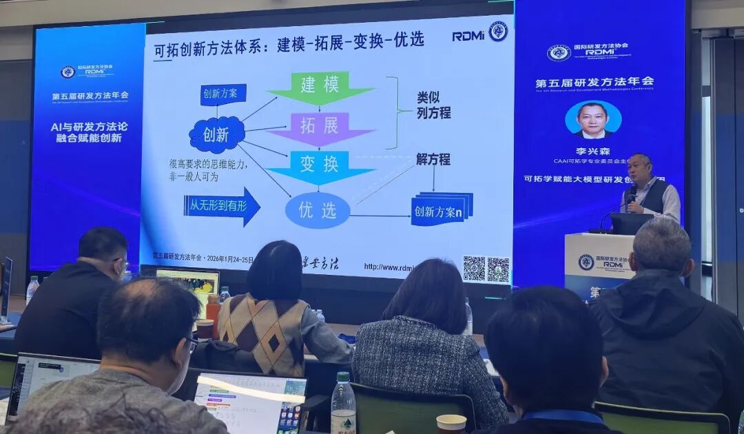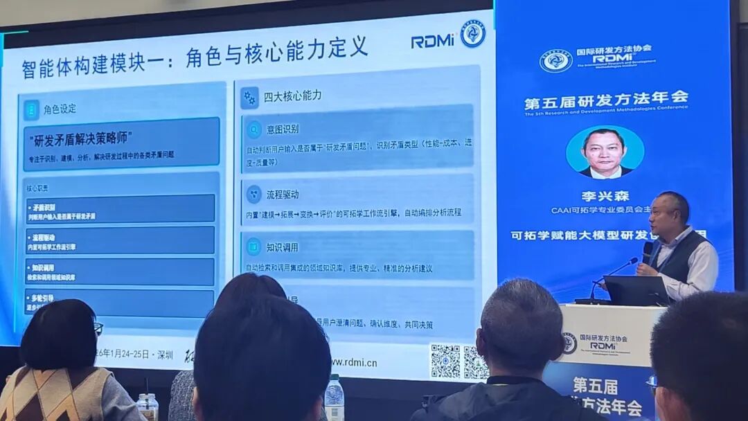 2026年1月24日-25日,第五届研发方法年会在深圳恒裕前海金融中心成功举办。广东工业大学可拓学与创新方法研究所李兴森教授应邀作《可拓学赋能大模型研发创新应用》主题报告。报告立足于原创学科可拓学的可拓创新方法体系与人工智能技术融合实践,系统性阐释了研发创新中矛盾问题的智能化处理路径,为科技创新、研发管理等领域提供兼具方法深度与实践价值的系统化解决方案,推动研发创新向系统化、智能化方向演进。